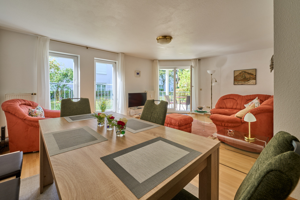 Ausstattung | • Feine, modern eingerichtete 3 Zi.Wohnung • komfortable Einbauküche • gepflegtes Bad mit Fenster, Dusche und Badewanne • geräumiges Zimmer mit Queen-Size-Bett und luxuriöse Bettwäsche • sep. Gäste WC • 2 Fernseher mit Kabelanschluss • gemütliche Essecke im Wohnraum mit Südterrasse • weiterer Wohnraum mit Schlafmöglichkeit • Parkettböden • Waschmaschine in der Wohnung • Lift • Garagen Stellplatz |